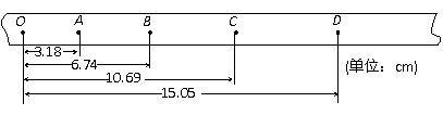 (2)下图是钩码质量为0.03 kg,砝码质量为0.02 kg时得到的一条纸带,在纸带上选择起始点0及A、B、C、D和E五个计数点,通过数据处理可获得各计数点对应时刻小车的瞬时速度v,
