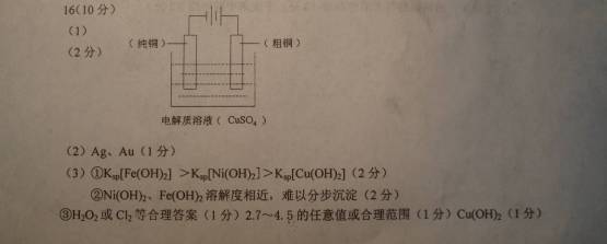 16.(10分)高纯铜(Cu%=99.99%)广泛应用于电器工业,某粗铜样品中含Fe、Ni、Ag、Au等杂质,用电解法进行精炼。