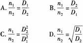 2. 现在许多高档汽车都应用了自动档无级变速装置,可不用离合就能连续变换速度,下图为截锥式无级变速模型示意图,两个锥轮之问有一个滚轮,主动轮、滚动轮、从动轮之间靠彼此之间的摩擦力带动,当位于主动轮和从动轮之间的滚动轮从左向右移动时,从动轮转速降低;滚动轮从右向左移动时,从动轮转速增加.现在滚动轮处于主动轮直经D1,从动轮直经D2的位置,则主动轮转速n1与从动轮转速n2的关系是:( )