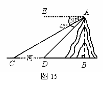 17、如图15,河旁有一座小山,从山顶A处测得河对岸点C的俯角为30°,测得岸边点D的俯角为45°,又知河宽CD为50米.现需从山顶A到河对岸点C拉一条笔直的缆绳AC,求缆绳AC的长(答案可带根号).