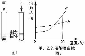 (3)20℃时,向两支试管中加入等质量的甲、乙两种固体物质,分别加入10 g水,使其充分溶解,观察到如右图1所示的现象。20℃时,