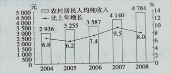 注:1. 2004-2009年中央连续颁发支持“三农”的一号文件。2.2008年中国农民人均纯收入达到了4761元,2007年是4140元,农民人均纯收入的增长率达到了8%。