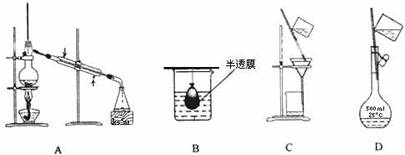 [解题指导]A项用来分离沸点不同的互溶液体;B项提纯胶体、C项固体与液体分离。D项只是配制一定物质的量浓度的溶液,不能分离物质。