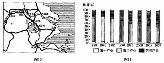 “长江三角洲地区主要城市分布图”(图10)和“1978-2007年上海三大产业产值比重变化统计图”(图11)。