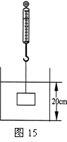 如图15所示,一个物体重10 N,用弹簧测力计悬挂着,完全浸没在圆柱形容器的水中.圆柱形容器厚度不计,自重4 N,放在水平桌面上,底面积100 cm2,将物块浸没水中后,容器内水面由16 cm上升到20 cm(g = 10N/kg).求: