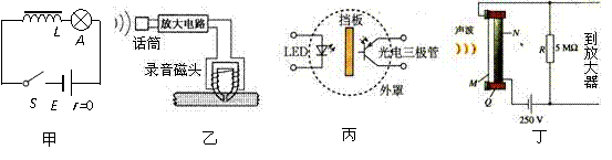 12.如图,甲是研究自感现象的实验电路图,乙是录音机的录音电路原理图,丙是光电传感的火灾报警器的部分电路图,丁是电容式话筒的电路原理图,下列说法正确的是