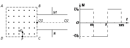 20.(12分)如图所示,在真空中,边长为2b的虚线所围的正方形区域ABCD内存在匀强磁场,磁场方向垂直纸面向外.在磁场右侧有一对平行金属板M和N,两板间距离为b,板长为2b,O1O2为两板的中心线,且O1为磁场右边界BC边的中点.有一电荷量为q、质量为m的带正电的粒子,以速率υ0从DC边某点P点沿垂直于DC的方向进人磁场,当粒子从O1点沿O1O2方向飞出磁场的同时,给M、N板间加上如图所示交变电压u(图中U0与T未知).最后粒子刚好以平行于N板的速度,从N板的边缘飞出.不计平行金属板两端的边缘效应及粒子所受的重力.求:
