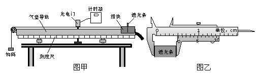 (2)某实验小组利用如图甲所示的实验装置来验证钩码和滑块所组成的系统机械能守恒.图乙所示是用游标卡尺测量遮光条的宽度,其读数为d= cm;实验时将滑块从图示位置由静止释放,由数字计时器读出遮光条通过光电门的时间Δt=1.2×10-2s,则滑块经过光电门时的瞬时速度为 m/s.在本实验中,为了验证系统的机械能是否守恒,需要测量的物理量除了钩码的质量外,还需要测量 和 .