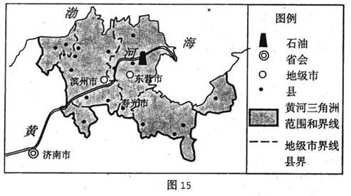 材料一:黄河三角洲及其附近地区位置示意图(图15)