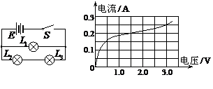 下左图所示电路中,电源电动势为3.0V,内阻不计,L1、L2、L3为3个相同规格的小灯泡,这种小灯泡的伏安特性曲线如下右图所示。开关S闭合后下列判断正确的是