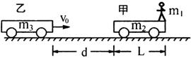 25.(18分)如图所示,质量为m1=50kg的某学生(可视为质点)站在长为L=3m、质量为m2=100kg的甲车右端,人和车均处于静止状态,地面水平光滑.一质量为m3=100kg的乙车以速度v0=3m/s向右运动.当该学生发现乙车时,两车距离为d=5m,该学生马上在甲车上向左匀加速跑动,跑到甲车车尾后从甲车跳到乙车上,假设该生跳到乙车后马上相对乙车静止.求: