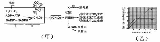 16.(8分) 如图甲为生物体内有关物质间的转化示意图,图乙A、B两植物的光合作用强度与光照强度的关系,(CO2吸收速度代表光合作用强度),请据图回答: