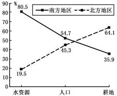 读“我国南、北方水资源、人口及耕地分布对照图(%)”,回答3-4题。