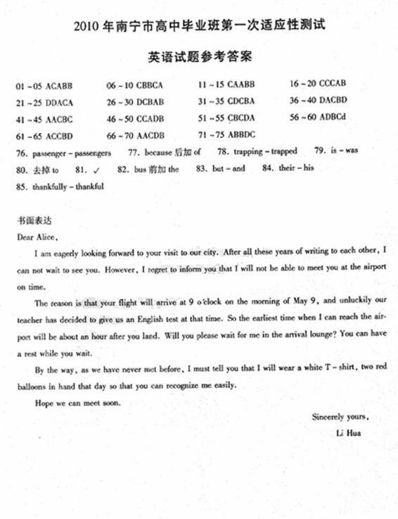 假如你是李华,你的一个笔友Alice,将要来你市参观游玩。本来你答应要去机场接她的,但是由于某些原因,你不能按时去接机。为此,你给她发一封e - mail,内容包括: