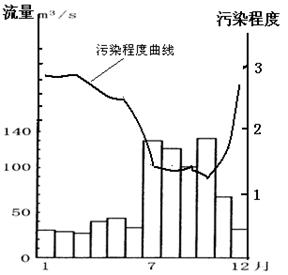 人类的不恰当活动,常造成严重的水质污染,从而破坏了水体环境。下图是黄河中游某支流一水文站流量和污染程度的实测结果,据此回答下列问题。