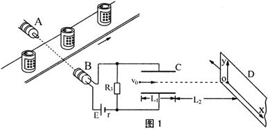26.(20分)如图1所示,为利用光敏电阻检测传送带上物品分布从而了解生产线运行是否运行正常的仪器.其中A是发光仪器,B是一端留有小孔用绝缘材料封装的光敏电阻.当传送带上没有物品挡住由A射向B的光信号时,光敏电阻阻值为R1=50Ω;当传送带上有物品挡住由A射向B的光信号时,光敏电阻阻值为R2=150Ω.固定电阻R3=45Ω.C为平行板电容器,虚线与两极板距离相等,极板长L1=8.0×10-2m,两极板的间距d=1.0×10-2m.D为屏,与极板垂直,D到极板的距离L2=0.16m,屏上贴有用特殊材料做成的记录纸,当电子打在记录纸上时会留下黑点,工作时屏沿图示方向匀速运动.有一细电子束沿图中虚线以速度v0=8.0×106m/s连续不断地射入电容C,v0延长线与屏交点为O.图2为一段记录纸.已知电子电量e=1.6×10-19C,电子质量m=9×10-31kg.忽略细光束的宽度、电容器的充电放电时间及电子所受的重力.求:电源的电动势E和内阻r.