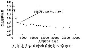 农业结构演变的规律性一般可用农业结构系数简单模拟,即种植业与林牧渔业产值的比值。下图为我国东部地区(指京、津、冀、鲁、沪、苏、浙、闽、粤、琼10省市)1978年--2005年农业结构系数与人均GDP关系图,读图回答6--8题。