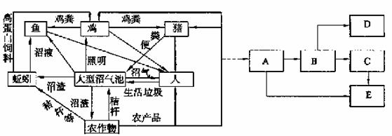 (4)右上图是能量流经鸡种群的示意图,其中A表示鸡的摄入量,D表示鸡自身的呼吸消耗量,那么B中的能量表示 ;此生态系统能量流动的特点是 。