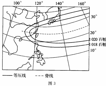 我国东部地区的主要锋面雨带,通常位于西太平洋副热带高压脊线以北5-8个纬度距离处,并跟随西太平洋副热带高压的北进或南退而移动。图3为“西太平洋副热带高压脊线位置示意图”。读图回答4-5题。