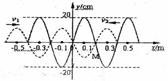 10.浙江省金华一中2010届高三12月联考如图所示为两列沿绳传播的(虚线表示甲波,实现表示乙波)简谐横波在某时刻的波形图,M为绳上x=0.2m处的质点,则下列说法中正确的是 ( A )