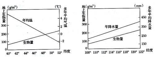 生物量一般是指生物在某一时刻单位面积内实存生活的有机物质(干重)总量。图5和图6是我国某区域地上生物量、年平均气温和年降水量随经纬度的线性变化。读图5和图6回答6-7题。