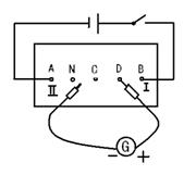 (6分)如图所示,为描绘电场中等势线的装置,图中A、N、C、D、B间距相等,其中A、B为家属圆柱,当电流从正接线柱流入灵敏电流表时,其指针向正接线柱一侧偏转。