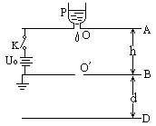 (18分)块相同的金属平板A、B、D自上而下水平放置,间距分别为h和d,如下图所示.A、B两板中心开孔,在A板的开孔上搁有一金属容器P,与A板接触良好,其内盛有导电液体.A板通过闭合的电键K与电动势为U0的电池的正极相连,B板与电池的负极相连并接地.容器P内的液体在底部小孔O处形成质量为m,带电量为q的液滴后自由下落,穿过B板的开孔O′落在D板上,其电荷被D板吸附,液体随即蒸发,接着容器底部又形成相同的液滴自由下落,如此继续.设整个装置放在真空中.
