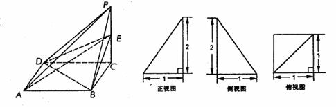 已知四棱锥P-ABCD的三视图如下图所示,E是侧棱PC上的动点。