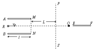 5. 如图所示,两平行金属板A、B长l=8cm,两板间距离d=8cm,两板间电势差UAB=300V.一带正电的粒子电量q=10-10C,质量m=10-20kg,从R点沿电场中心线垂直电场线飞入电场,初速度v0=2×106m/s,粒子飞出平行板电场后经过界面MN、PS间的无电场区域后,进入固定在中心线上的O点的点电荷Q形成的电场区域(设界面PS右边点电荷的电场分布不受界面的影响)。已知两界面MN、PS相距为L=12cm,粒子穿过界面PS最后垂直击中放置于中心线上的荧光屏EF.要求:(静电力常数k=9×109N·m2/C2)