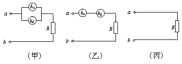 13.(12分)在如图2-8-13所示的三个电路中,a、b间的电压恒定不变,(甲)图中电流表A1的示数为2 A,A2的示数为3 A;(乙)图中两个电流表的示数均为4 A,试求通过(丙)图中定值电阻R的电流多大?