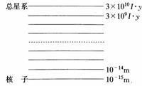 收集资料 图2.1-6是长度阶梯的一部分.请查阅相关资料将其余部分补上.并把原子、分子、人的身高、珠穆朗玛峰的高度、地球的直径、月球距离等相关的典型尺度标记在线旁(I·y=9.46×1015m).