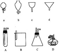 (8分)如右图所示a、b、c、d分别是几种常见漏斗的上部,A、B、C、D是实际操作中各漏斗的下部插入容器中的示意图,请指出A、B、C、D分别与a、b、c、d相匹配的组合及其组合后装置在实验中的应用,例如:C和a组合,用于制取气体。