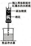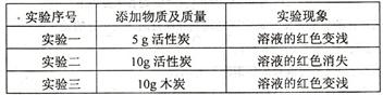 小红自制了三个简易净水器(如下图所示),并分别向其中添加了如下表所示的物质,做了三个对比实验。实验中观察到的红墨水的水溶液的颜色变化情况,记录如下。