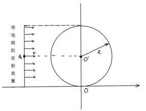方法一:从任一点P水平进入磁场的带电微粒在磁场中做半径为R的匀速圆周运动,其圆心位于其正下方的Q点,如图b所示,这束带电微粒进入磁场后的圆心轨迹是如图b的虚线半圆,此圆的圆心是坐标原点为。