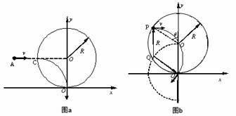 方法二:从任一点P水平进入磁场的带电微粒在磁场中做半径为R的匀速圆周运动。如图b示,高P点与O′点的连线与y轴的夹角为θ,其圆心Q的坐标为(-Rsinθ,Rcosθ),圆周运动轨迹方程为