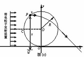 带电微粒在磁场中经过一段半径为r′的圆弧运动后,将在y同的右方(x>0)的区域离开磁场并做匀速直线运动,如图c所示。靠近M点发射出来的带电微粒在突出磁场后会射向x同正方向的无穷远处国靠近N点发射出来的带电微粒会在靠近原点之处穿出磁场。