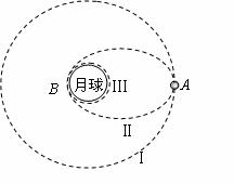 ,飞船在距月球表面高度为3R的圆形轨道Ⅰ运动,到达轨道的A点点火变轨进入椭圆轨道Ⅱ,到达轨道的近月点B再次点火进入月球近月轨道Ⅲ绕月球作圆周运动。求: