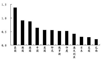 (2)根据材料四,图中 、 等国家,以贸易立国,对外贸易依存度较高。美国、日本、巴西等大国对外贸易依存度较低。其中贸易依存度较高的地区,其经济类型为 。(6分)