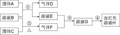 20、(14分) 以下为中学常见物质,转化关系如下。C与B溶液反应产生气体F,D可在F中燃烧,图中部分产物略去。