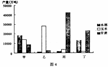图4是四个国家三种农作物产量统计图,读图回答7-题。