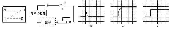 14、某一电学黑箱内可能有电容器、电感线圈、定值电阻等元件,在接线柱间以如图所示的“Z”字形连接(两接线柱间只有一个元件)。为了确定各元件种类,小华同学把DIS计算机辅助实验系统中的电流传感器(相当于电流表)与一直流电源、滑动变阻器、开关串联后,分别将AB、BC、CD接入电路,闭合开关,计算机显示的电流随时间变化的图象分别如图a、b、c所示,则如下判断中正确的是 ABD