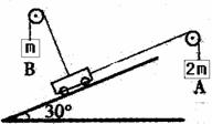 在倾角为300光滑固定斜面上,用两根轻绳跨过固定滑轮接在小车上,两端分别悬挂质量为m和2m的物体A、B,当小车静止对两绳分别平行、垂直于斜面,如图所示。不计滑轮摩擦,现使A,B位置互换,当小车再次静止平衡时,下列回答正确的是( )