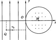 (16分)如图所示,在平面坐标系xoy内,第Ⅱ、Ⅲ象限内存在沿Y轴正方向的匀强电场,第1、Ⅳ象限内存在半径为L的圆形匀强磁场,磁场圆心在M(L,0)点,磁场方向垂直于坐标平面向外.一带正电粒子从第lll象限中的Q(-2L,-L)点以速度v0沿x轴正方向射出,恰好从坐标原点O进入磁场,从P(2L,0)点射出磁场.不计粒子重力,求:(1)粒子到达O点时的速度