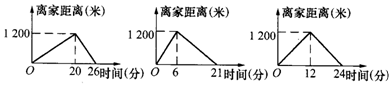 21.小刚的爸爸、爷爷同时从家中出发到达同一目的地后都立即返回,小刚去时骑自行车,返回时步行,爷爷去时步行,返回时骑自行车,爸爸往返都是步行,三人步行的速度不等,小刚与爷爷骑自行车的速度相等,每个人离家的距离与行走的时间关系分别是图中的一个,问: