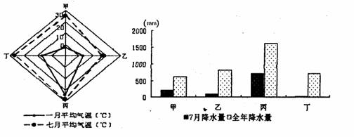 读甲、乙、丙、丁四个地区的气温雷达图和降水柱状图,回答9—11题。