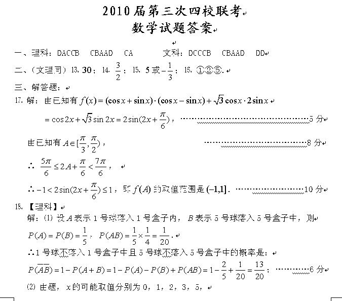 ⒙(12分)将编号为1,2,3,4,5的五个相同小球,随机放入编码分别为1,2,3,