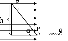 28.安徽省利辛二中2010届高三上学期第四次月考一质量为M=6kg带电量为q= -0.1C的小球P自动摩擦因数u=0.5倾角θ=53°的粗糙斜面顶端静止开始滑下,斜面高h=6.0m,,斜面底端通过一段光滑小圆弧与一光滑水平面相连。整个装置处在水平向右的匀强电场中,场强E=200N/C,忽略小球在连接处的能量损失,当小球运动到水平面时,立即撤去电场。水平面上有另一与P球一摸一样的小球Q,小球Q不带电,且Q与轻质绝缘弹簧相连接。如图所示, 设Q静止,P运动到水平面与弹簧发生碰撞。(sin53°=0.8 ,cos53°=0.6 ,g=10m/s2 。)