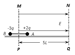 上海市六校2010届高三第一次联考在光滑绝缘的水平面上,用长为2L的绝缘轻杆连接两个质量均为m的带电小球A和B。A球的带电量为+2q,B球的带电量为-3q,组成一带电系统,如图所示,虚线MP为AB两球连线的垂直平分线,虚线NQ与MP平行且相距5L。最初A和B分别静止于虚线MP的两侧,距MP的距离均为L,且A球距虚线NQ的距离为4L。若视小球为质点,不计轻杆的质量,在虚线MP,NQ间加上水平向右的匀强电场E后,试求: