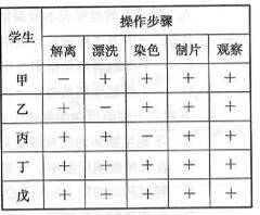 (8分)在观察植物细胞的有丝分裂”实验中,甲-戊五位同学剪取洋葱(体细胞染色体数为16条)根尖后,立即进行如下表所示的操作步骤(其中“+”表示进行了该项操作,“一”则表示没有进行):