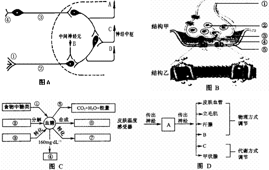 (3)图C中促进②进行分解的激素有___________________,⑥代表的物质有__ __。图D中A结构的名称为_______________。